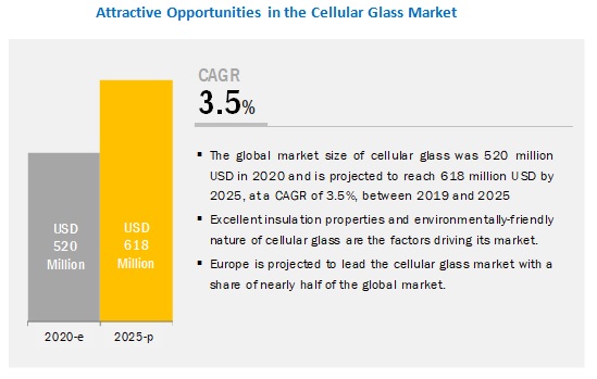 The global cellular glass market is projected to reach USD 618 million by 2025, at a cagr 3.5%. High-quality insulation for industrial purposes and protection against fire and long life are the driving factors for the growth of the cellular glass industry. Also, environmental regulations and new application areas are projected to boost the demand for cellular glass in the coming years.