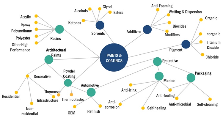 Paints and Coatings are formed of solvent, binder, additives, hardeners, and pigments which are supplied by a number of raw material manufacturers and suppliers or distributors. These are used for their protective characteristics in different end-use industries such as marine, infrastructure, oil & gas, power generation, water treatment, and others. The paints and coatings industry is nowadays focusing on advanced, cost-effective, high-performance materials that offer permeability, thereby increasing the product’s shelf life. It is undergoing continuous technological up-gradation concerning the design and development of raw materials.