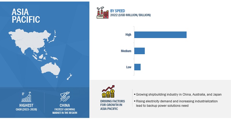 Asia Pacific is expected to fastest growing region in the diesel engines market between 2023–2028, followed by North America and Europe. The rising number of boats, crafts, and vessels will contribute to the growth of propulsion systems and small marine engines in the Asia Pacific region. The demand for small marine engines in the defense sector is also expected to increase because of the ongoing territorial conflicts among countries such as China, the Philippines, North Korea, Japan, India, Vietnam, Pakistan, and Afghanistan, thereby driving the diesel engine market in the region for marine applications. Hence, these factors are expected to fuel the growth of the diesel market in the Asia Pacific region.