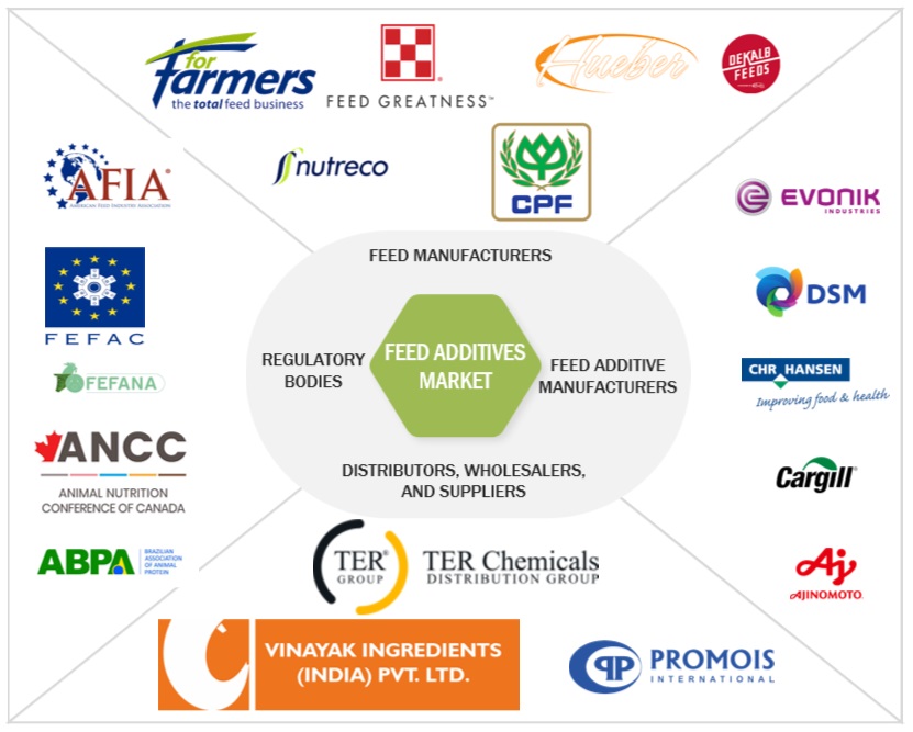 - Intermediary suppliers such as traders and distributors of feed additives such as amino acids, phosphates, enzymes, vitamins, acidifiers, carotenoids, mycotoxin detoxifiers, flavors & sweeteners, antibiotics, minerals, antioxidants, nonprotein nitrogen, phytogenics, preservatives, and probiotics