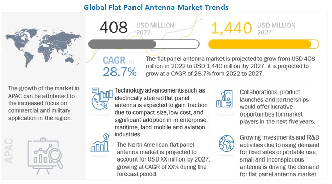The global flat panel antenna market size is expected to grow from USD 408 million in 2022 to USD 1,440 million by 2027, growing at a CAGR of 28.7% during the forecast period.