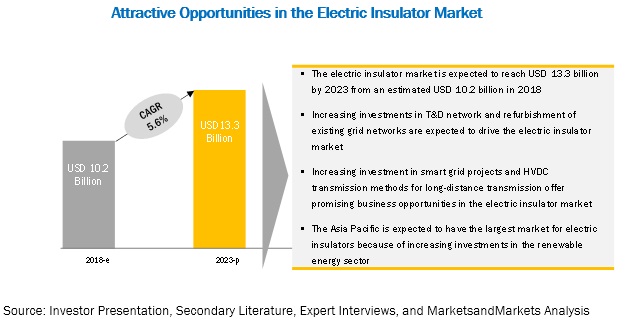 MarketsandMarkets forecasts the electric insulator market is projected to reach USD 13.3 billion by 2023, from an estimated USD 10.2 billion in 2018, at a CAGR of 5.6%. This growth can be attributed to the growing adoption of renewable energy sources, increasing investments in T&D networks, and refurbishment of existing grid networks across the globe. However, increasing grey market products of low quality can hinder the growth of the market.