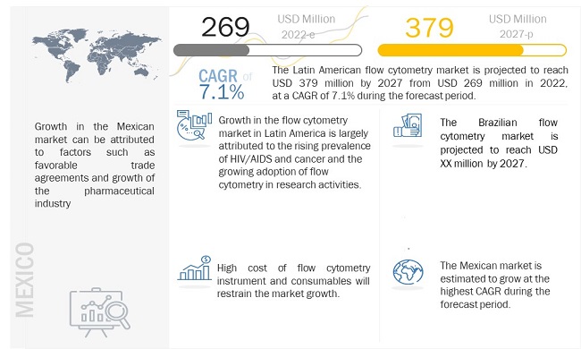 [207 Pages Report] The Latin American flow cytometry market is projected to reach USD 379 million by 2027, at a CAGR of 7.1% during the forecast period. The market growth can be attributed to factors such as increasing adoption of flow cytometry techniques in research activities. Besides, a rise in the prevalence of Cancer, HIV/ AIDS in the region has led to increase in research for drug development against these diseases. Such research activities involve the use of flow cytometry techniques. Moreover, top players in this market are consistently focusing on innovating to develop technologically superior flow cytometry instruments and software. These factors are expected to propel the growth of flow cytometry market in Latin America. However, these technologically advanced products are expensive. Thus, high cost of flow cytometry instruments and consumables is expected to restrain market growth to a certain extent.