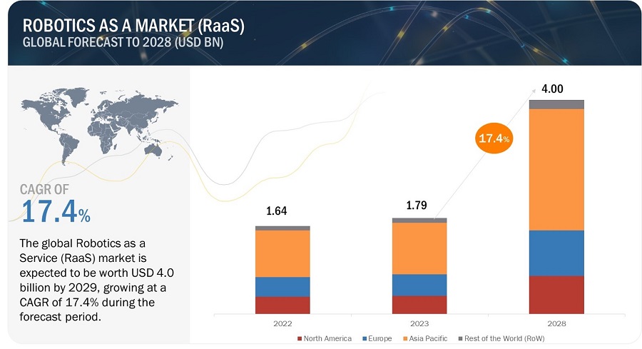 The global robotics-as-a-service market Size is expected to be valued at USD 1.8 billion in 2023 and is projected to reach USD 4.0 billion by 2028; growing at a CAGR of 17.4% during the forecast period.