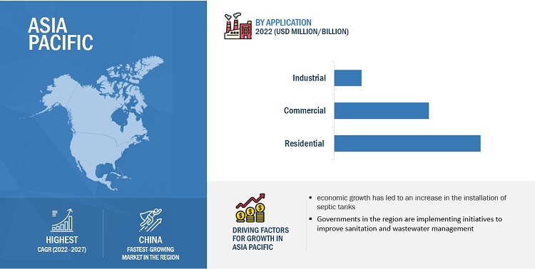 Asia Pacific is expected to be the fastest-growing region for the global Septic tanks market between 2022–2027. increase, urbanization, insufficient centralized sewage infrastructure, government initiatives, and economic growth, are likely to boost the demand for the Septic tanks market. The countries included are China, Japan, India, and South Korea.