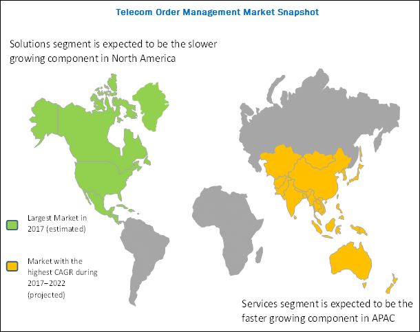 North America is expected to have the largest share in the telecom order management market during the forecast period. Driven by the expansion of Long-Term Evolution (LTE) networks in the region, Communication Service Providers (CSPs) are looking for new innovative solutions to standardize their 4G/LTE business models, provide better customer service, and measure the service quality and performance. These are the factors driving the growth of the North American region. APAC is expected to grow at the highest CAGR during the forecast period, as the region has the presence of creditable organizations that are gradually embracing the adoption of advanced technologies.