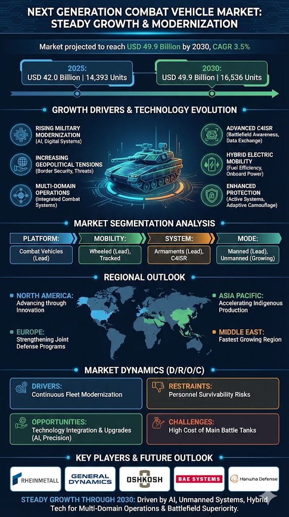 The Global Next Generation Combat Vehicle Market is entering a steady growth phase as military forces modernize armored fleets to address evolving battlefield threats. Within the broader Armored Vehicles Market, the industry is projected to grow from USD 42.0 billion in 2025 to USD 49.9 billion by 2030 at a CAGR of 3.5%. Armored vehicle volumes are expected to increase from 14,393 units in 2025 to 16,536 units by 2030, reflecting sustained procurement and modernization programs worldwide.
