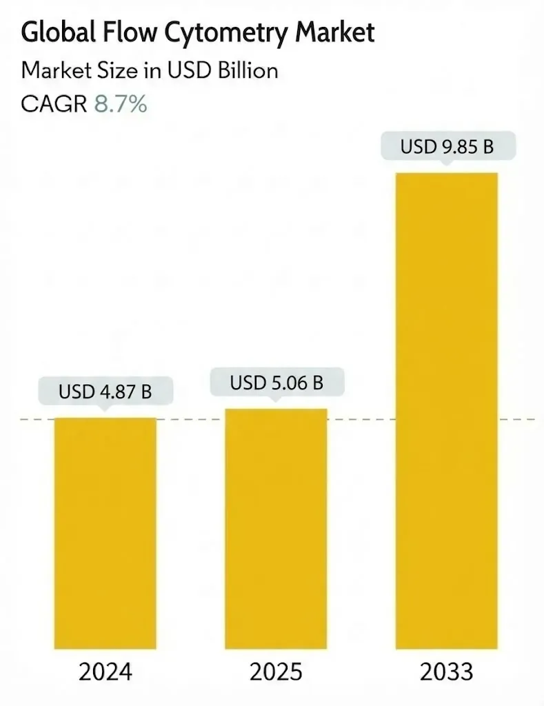 The flow cytometry market is experiencing a period of remarkable technological evolution and commercial expansion, driven by continuous advancements in spectral detection, microfluidics, and AI-powered data analysis; increasing adoption of flow cytometry in clinical diagnostics; rising prevalence of chronic diseases such as cancer, HIV, and autoimmune disorders that demand sophisticated immune profiling; and the explosive growth of biopharmaceutical R&D including cell therapy and immunotherapy programs where flow cytometry is an indispensable analytical tool. The global flow cytometry market is projected to grow from USD 5.06 billion in 2025 to USD 9.85 billion by 2033, at a CAGR of 8.7% over the forecast period. The integration of artificial intelligence and machine learning into cytometry data analysis platforms is further accelerating the utility and adoption of flow cytometry by enabling automated population identification, predictive biomarker discovery, and real-time quality control that reduce analytical complexity and enhance reproducibility across research and clinical applications. In this dynamic environment, the following 25 industry leaders stand out for their technological innovation, clinical and research market depth, and transformative contributions to the science and application of flow cytometry worldwide.